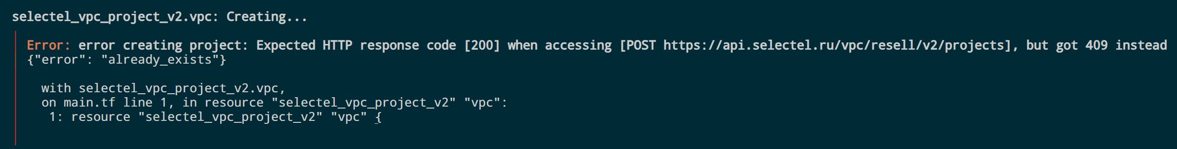 Наступили на грабли. Оно говорит, что проект уже существует. Так и есть, «ветка» production уже создала проект и «ветка» dev логично упала с ошибкой. Сейчас решим!